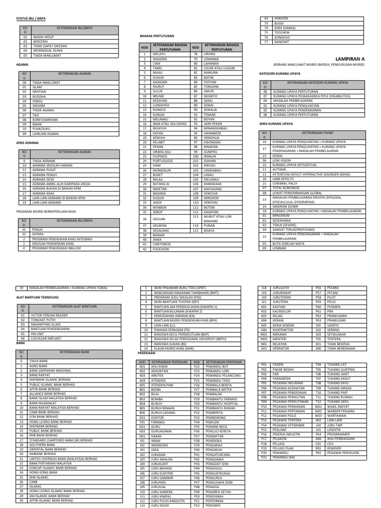 Kod Pekerjaan Borang Maklumat Murid Borang Maklumat Murid Versi Apdm